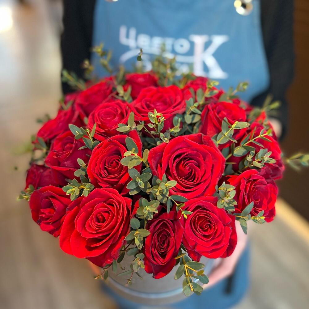 Роза Эквадор Красная – 25 шт.зелень эвкалипта – 2 шт.Коробка шляпная – 1 шт.Оазис флористический – 1 шт.