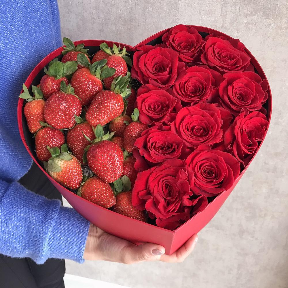Коробка в форме сердца из клубники и роз