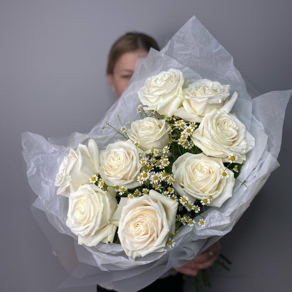 Роза Эквадор – 9 шт.Матрикария – 5 шт.Упаковка дизайнерская – 1 шт.подкормка для срезанных цветов – 1 шт.любовь флориста – 1 шт.записка с вашим текстом – 1 шт.шоколадный медиант ручной работы – 1 шт.советы по уходу за срезанными цветами – 1 шт.