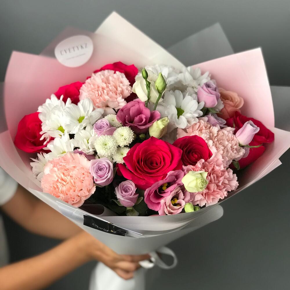 Гвоздики, Кустовые розы, Лизиантусы, Пионовидные розы, Розы