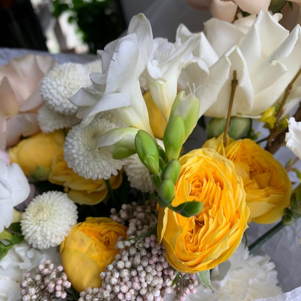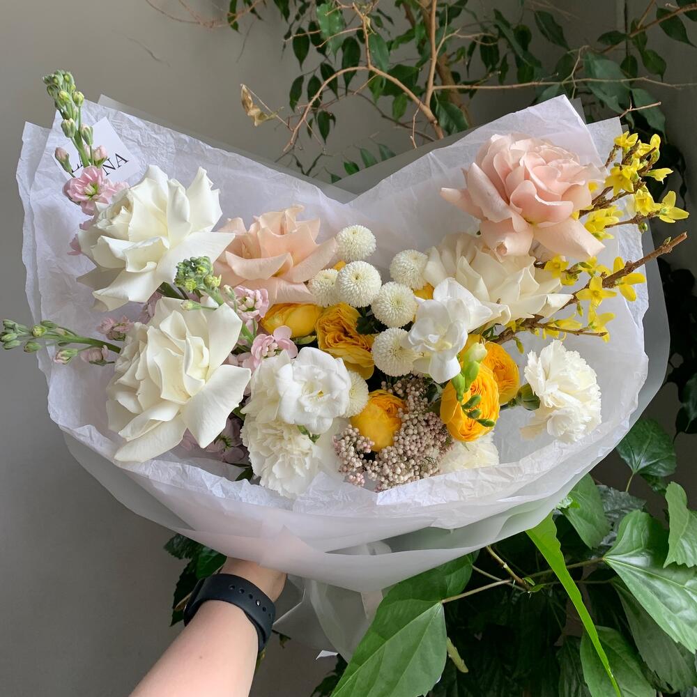 Маттиола фиолетовая – 3 шт.роза playa blanca – 3 шт.роза quicksand – 2 шт.роза sunny trendsetter – 2 шт.Фрезия белая – 2 шт.Озотамнус – 1 шт.хризантема coconut – 1 шт.гвоздика белая сортовая – 3 шт.Форзиция – 2 шт.Упаковка дизайнерская – 1 шт.Лента атласная – 1 шт.инструкция по уходу за цветами – 1 шт.Кризал (подкормка) – 1 шт.Транспортировочная коробка – 1 шт.Аквапак – 1 шт.