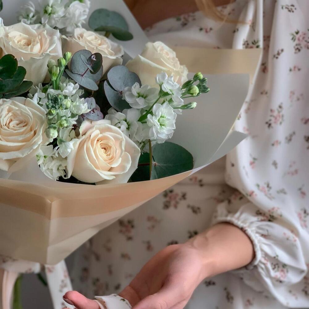 Маттиола белая – 4 шт.роза плая бланка – 5 шт.Эвкалипт Микс – 2 шт.Упаковка дизайнерская – 1 шт.
