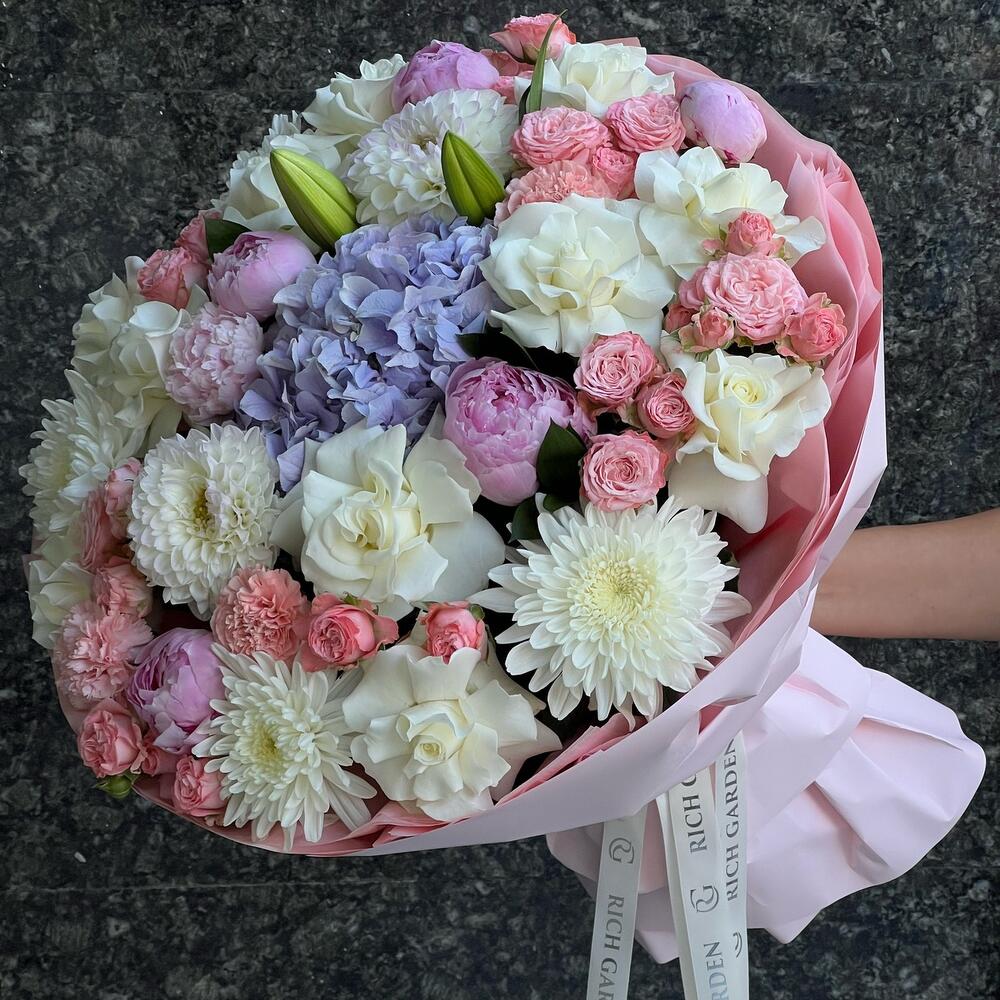 Категорий: Гвоздики, Георгины, Гортензии, Лилии, Пионовидные розы, Пионы, Розы, Хризантемы