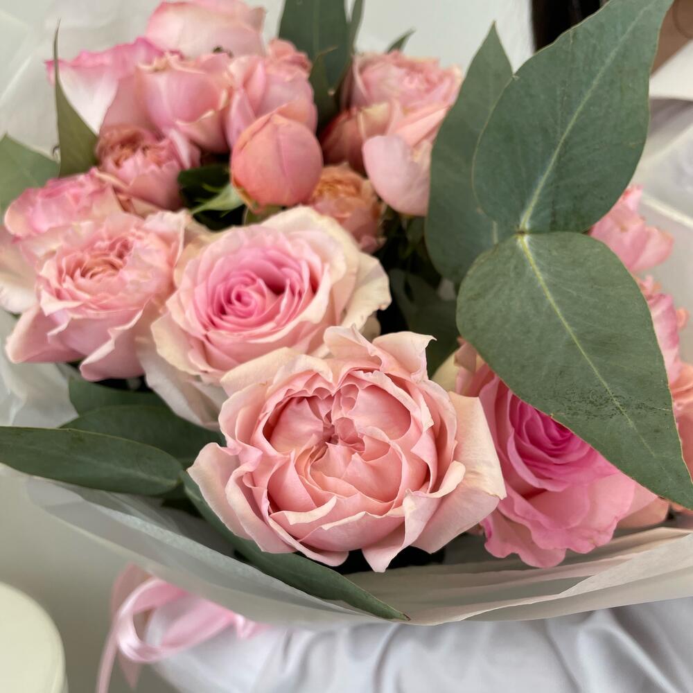 Эвкалипт – 2 шт.Роза – 5 шт.Тишью – 2 шт.Кустовая пионовидная роза – 4 шт.Упаковка дизайнерская – 1 шт.