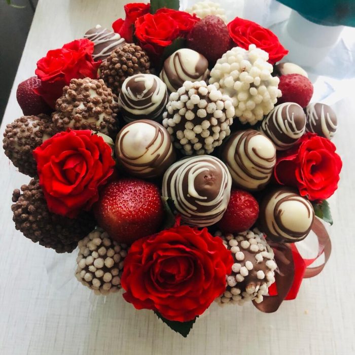Роза – 7 шт.Лента атласная – 1 шт.Шляпная коробка – 1 шт.Клубника в шоколаде – 500 гр.