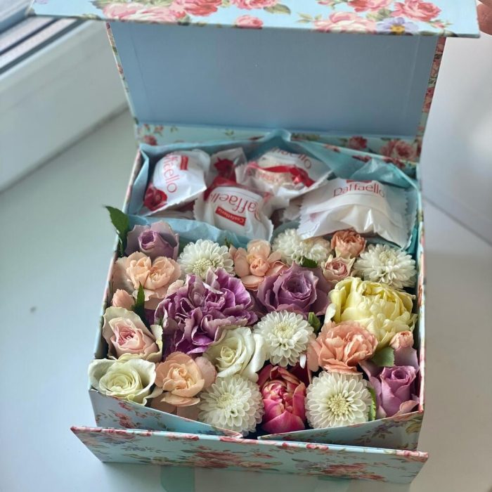 Кустовая роза – 4 шт.Зелень – 1 шт.Раффаэлло – 100 гр.Хризантема – 3 шт.Гвоздика – 3 шт.Эустома – 1 шт.Оазис – 1 шт.Коробка – 1 шт.