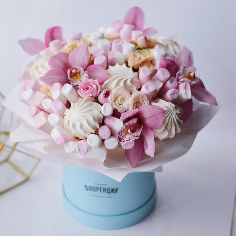 Орхидея Цимбидиум – 5 шт.Роза кустовая пионовидная – 4 шт.Маршмеллоу (пачка) – 2 шт.Зефир – 6 шт.пастила пачка – 1 шт.Коробка шляпная – 1 шт.Упаковка дизайнерская – 1 шт.