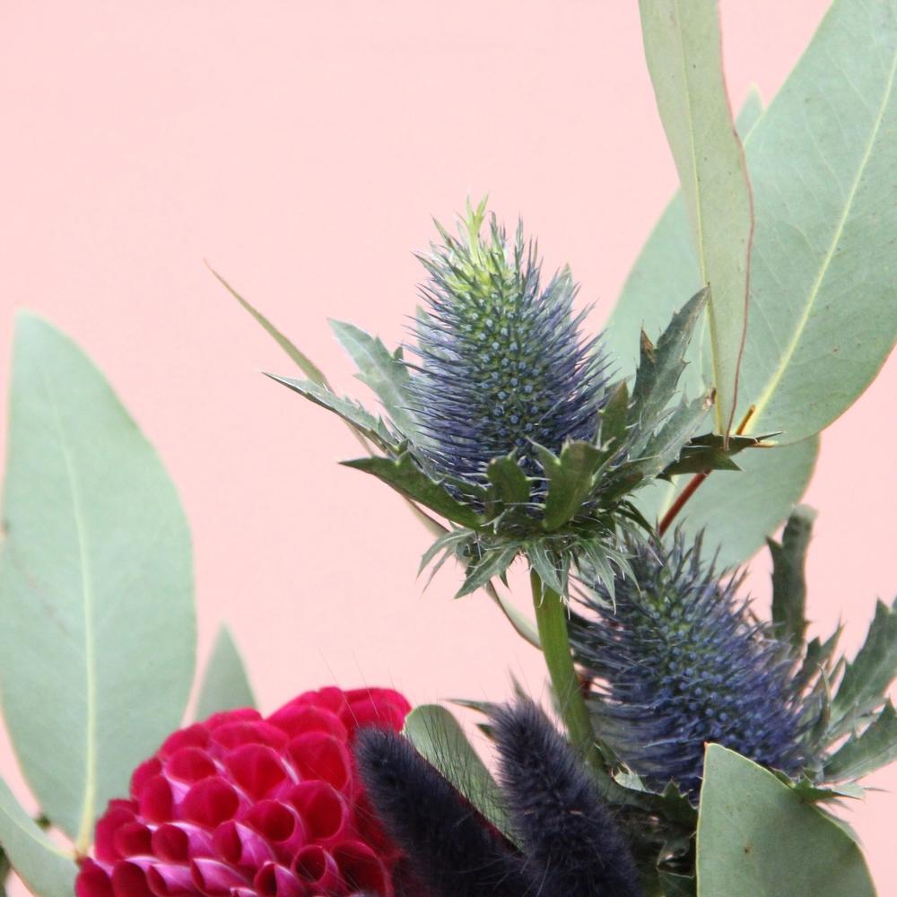 Пион – 2 шт.Роза пионовидная – 6 шт.Георгина – 3 шт.Эрингиум – 2 шт.Лагурус – 10 шт.Эвкалипт – 10 шт.Лента атласная – 2 шт.