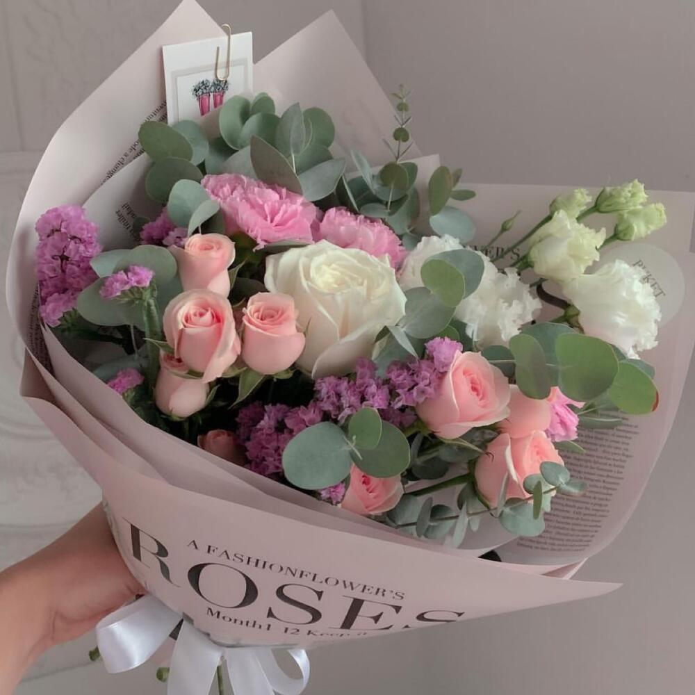 плая бланка – 1 шт.Лизиантус – 1 шт.Диантус – 2 шт.Кустовая роза – 2 шт.Статица – 2 шт.Эвкалипт – 1 шт.Упаковка дизайнерская – 1 шт.