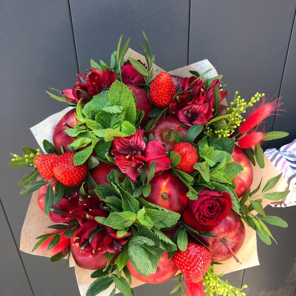 нектарины или сливы – 7 шт.яблоки – 7 шт.Мята пучок – 4 шт.Альстромерия – 8 шт.Лагурус – 6 шт.фисташка зелень – 3 шт.розы – 2 шт.