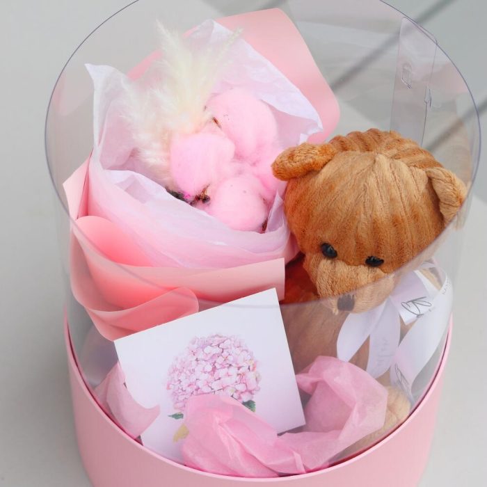 Лента атласная – 1 шт.Тишью – 1 шт.Шляпная коробка – 1 шт.Мишка плюшевый – 1 шт.Открыточка с вашими пожеланиями – 1 шт.шоколадка – комплимент для получательницы от нашей мастерской – 1 шт.букет из сухоцветов (хлопок – 1 шт.сетария) – 1 шт.
