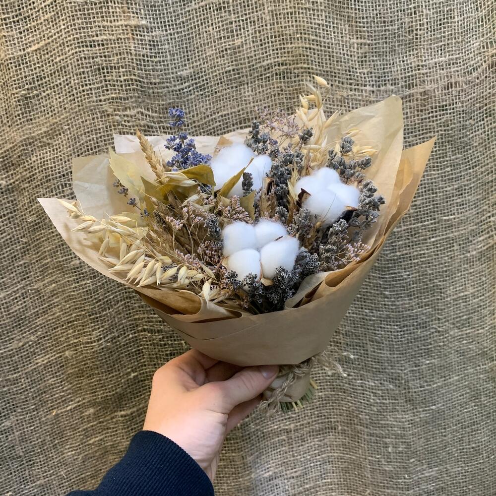 Лимониум – 1 шт.Тишью – 1 шт.Пшеница (сухоцвет) – 17 шт.бечевка натуральная – 1 шт.овес сухоцвет – 7 шт.хлопок белый – 3 шт.лаванда крымская – 1 шт.крафт натуральный – 1 шт.листья искуственные – 2 шт.лаванда садовая – 1 шт.