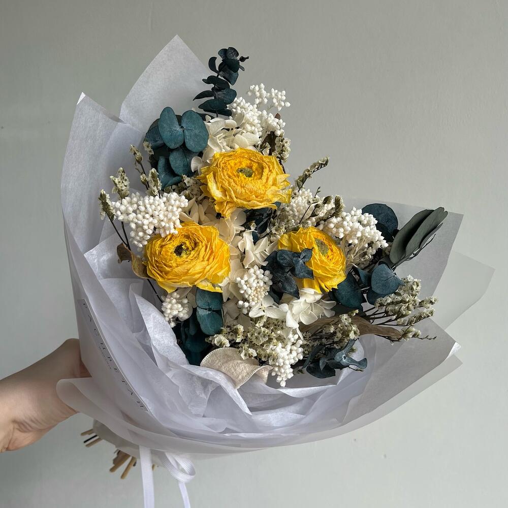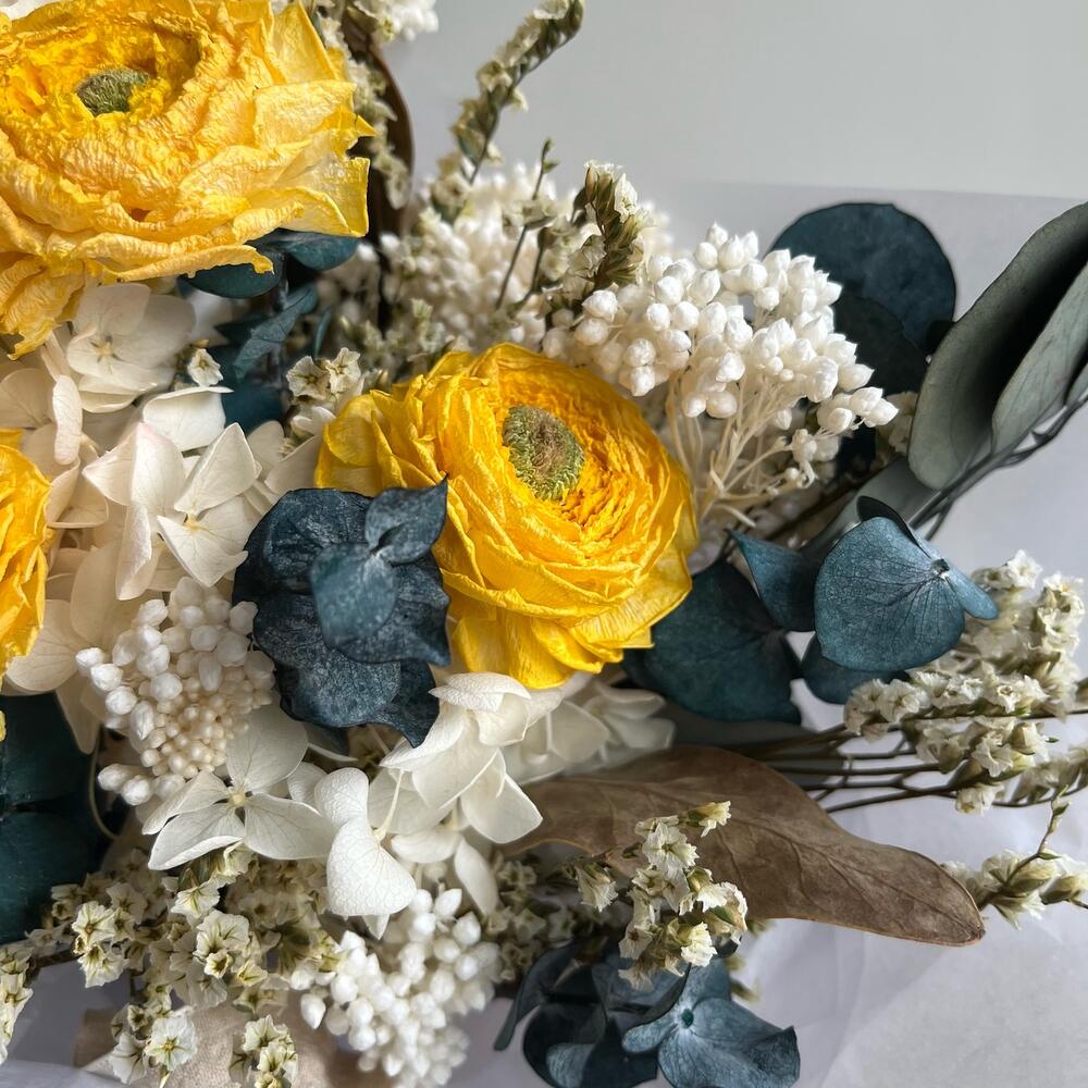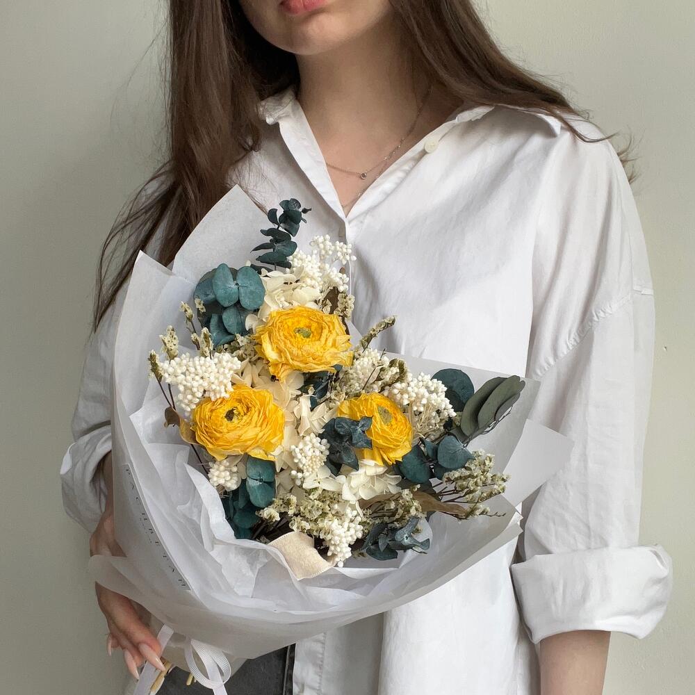 Лимониум – 2 шт.Озотамнус – 2 шт.Эвкалипт – 4 шт.Упаковка дизайнерская – 1 шт.листья протеи – 3 шт.ранункулюс сухоцвет – 3 шт.