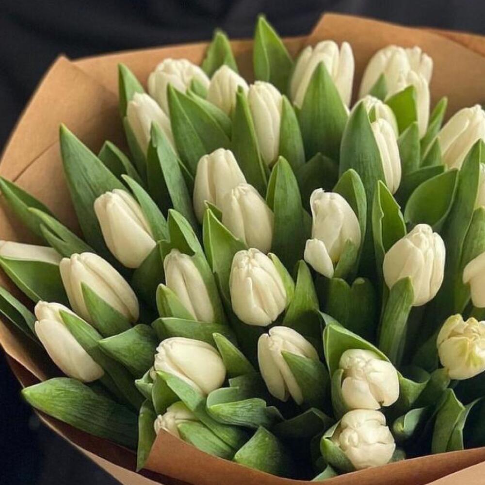 Тюльпан белый – 51 шт.Упаковка дизайнерская – 1 шт.Лента атласная – 2 шт.Открыточка с вашими пожеланиями – 1 шт.хорошее настроение – 100 шт.инструкция по уходу за цветами – 1 шт.коробка переноска – 1 шт.Кризал – 1 шт.