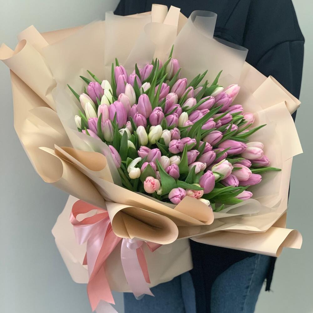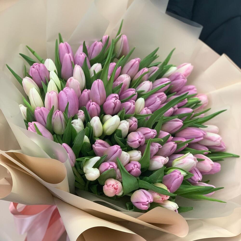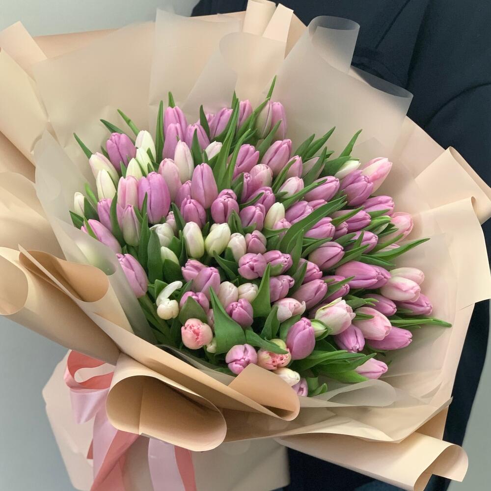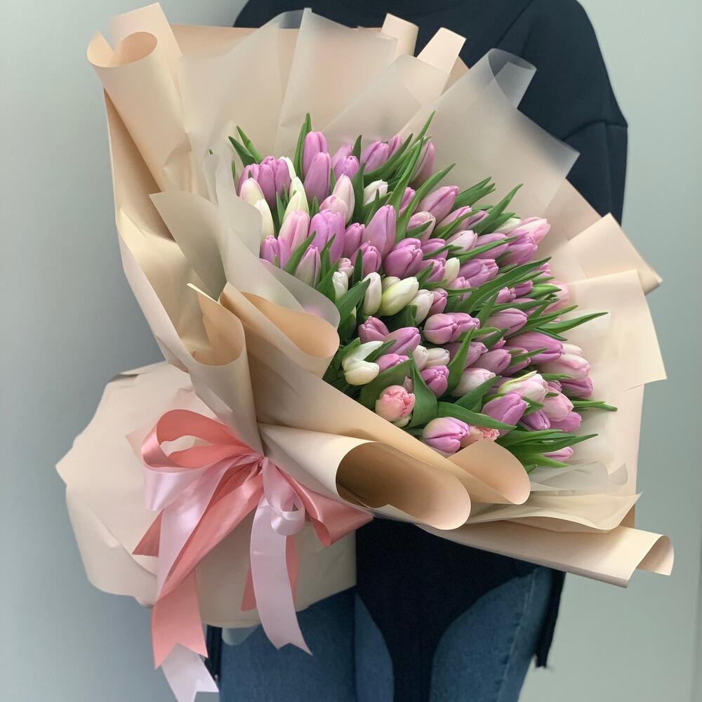 Тюльпан – 101 шт.дезайнерская упаковка – 2 шт.Атласная лента – 1 шт.
